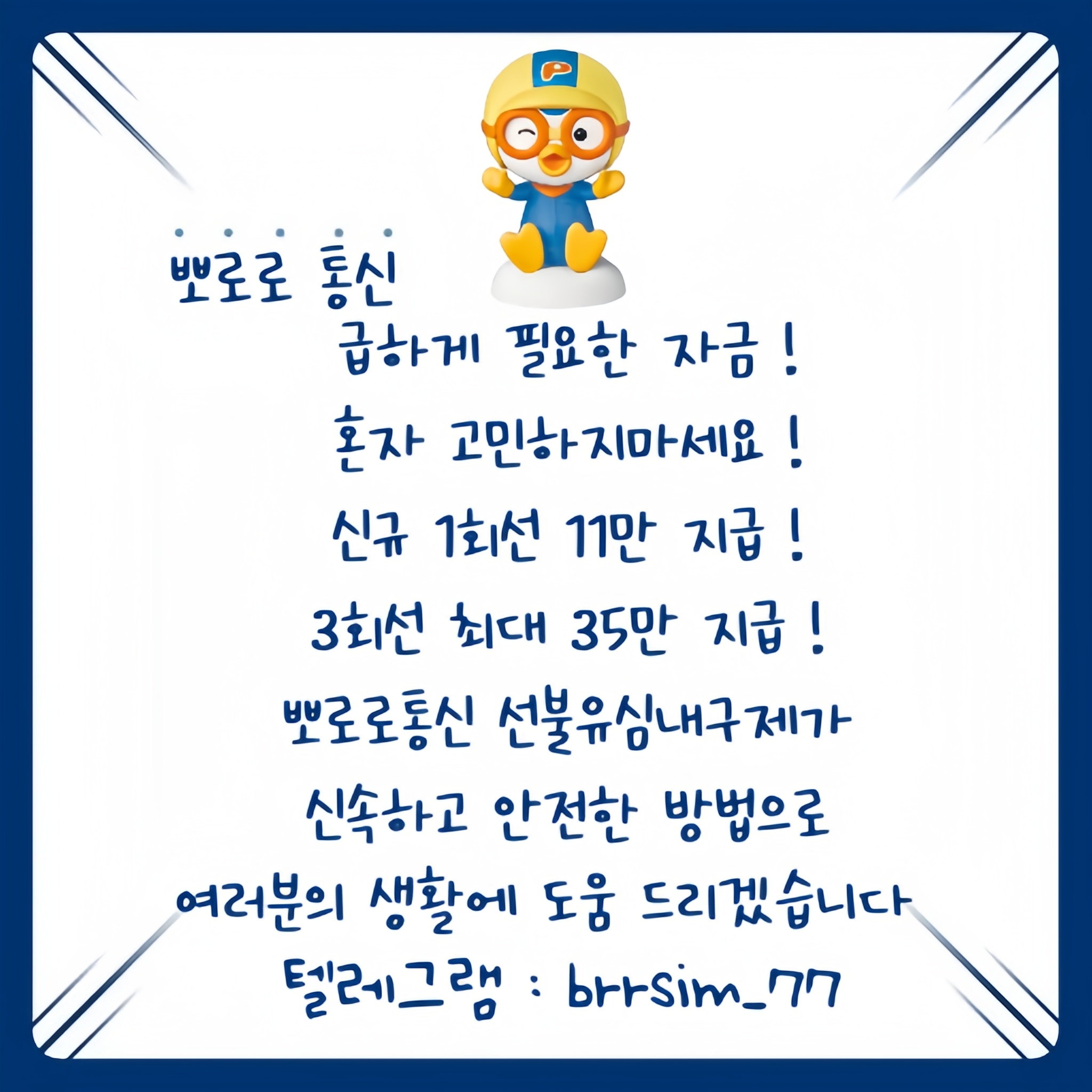 뽀로로 통신 선불유심내구제 서비스는 무직자,신불자,회생자,대학생 등 만 19세이상 누구나 이용 가능한 바로소액급전 생계자금 지원시스템입니다 !